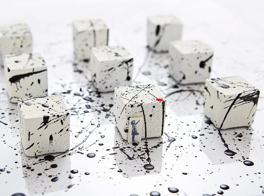 Το έργο του Banksy Girl With a Balloon είναι ένα κέικ με λευκή σοκολάτα σε κύβο με γέμιση παγωτό βανίλια, τζελ κεράσι, καραμέλα από φουντούκι και crémeux σοκολάτας. Στο τελείωμα θα βρεις και μια μικρή ρεπλίκα του έργου να διακοσμεί το γλυκό.