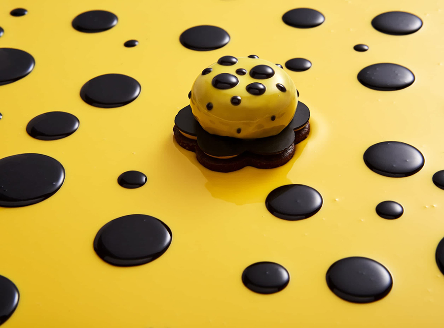 Ένα από τα αγαπημένα του σεφ είναι το Kusama cake, που έχει βάση sablé μπισκότο, με μους από σοκολάτα γάλακτος crémeux από φρούτα του πάθους και μια σοκολατένια feuillantine με ένα κίτρινο γλασάρισμα.