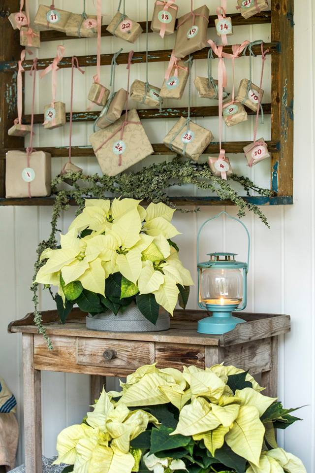 Η περίοδος προ των Χριστουγέννων έχει συνολικά 4 Κυριακές και αυτό το advent calendar έχει ένα δώρο για κάθε μια. Τα δωράκια είναι τυλιγμένα με χαρτί περιτυλίγματος και κρέμονται σε μια rustic κρεμάστρα με ασπρόμαυρη κορδέλα. Μικροί ξύλινοι δίσκοι με νούμερα δείχνουν τη κάθε Κυριακή στην οποία μπορεί να ανοιχτεί το κάθε δώρο και τα κομμένα αλεξανδρινά μαζί με φύλλα ευκάλυπτου δίνουν έξτρα χριστουγεννιάτικη αίσθηση, στολίζοντας τις μικρές εκπλήξεις. Με αλεξανδρινά και φύλλα ευκάλυπτου έχει στολιστεί επίσης και ένα απλό στεφάνι, το οποίο κοσμεί την κρεμάστρα, ολοκληρώνοντας πιο αρμονικά τη σύνθεση.